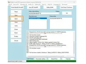 Вернитесь в программное обеспечение программатора RT809F, нажмите кнопку "Open" и выберите только что созданный файл "your-bios-chip-name-WRITE.bin".