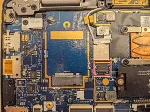 Используя обратный метод, как и ранее, подогрейте область горячим воздухом и припаивайте чип на место. Он должен точно совпасть с контуром, нанесённым на материнской плате.