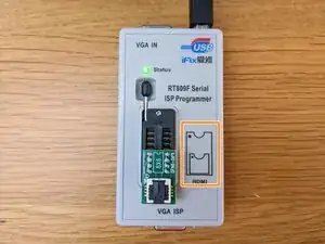 Подготовьте последовательный программатор RT809F. Установите адаптер WSON8 в нижнюю часть слота, как показано на рисунке на программаторе.