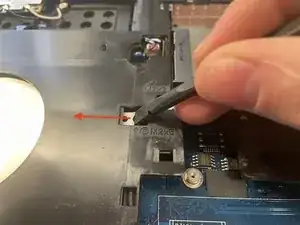 Переверните ноутбук и откройте экран, аккуратно подденьте пластиковую лопатку под верхнюю панель рядом с клавишей Ctrl внизу слева и приподнимите