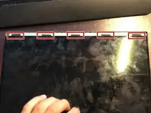 Снимите крышку камеры, чтобы добраться до дополнительных винтов. Возьмите лопатку или медиатор и подденьте крышку между петлёй, как только начнёте, можно сдвинуть медиатор под крышку по всей длине дисплея. Будьте осторожны с камерой.