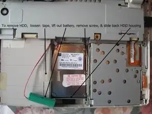 Чтобы снять жёсткий диск, ослабьте скотч, извлеките батарейку BIOS, снимите винты и сдвиньте в сторону корпус жёсткого диска.