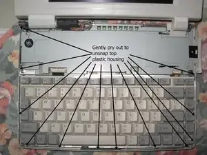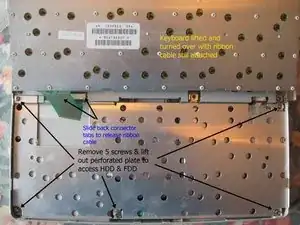 Поднимите клавиатуру и переверните, но не снимайте — она всё ещё подключена ленточным кабелем.