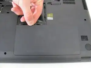 Сдвиньте защёлку фиксации аккумулятора влево, пока аккумулятор не отделится от своего посадочного места.