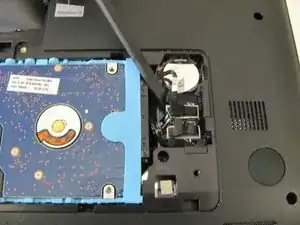Ослабьте два винта Phillips #00, которые фиксируют крышку отсека жёсткого диска.