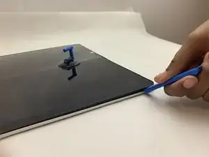 Возьмите инструмент для вскрытия и введите его между резиновым уплотнителем вокруг экрана и задней панелью, затем начните приподнимать, чтобы отжать панель.