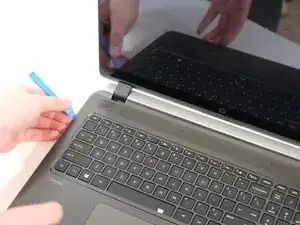 С помощью лопатки подденьте по шву между корпусом и областью клавиатуры/тачпада. Обойдите корпус полностью.