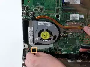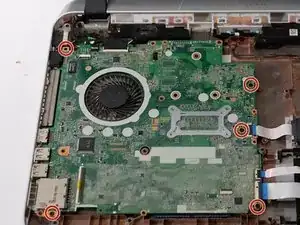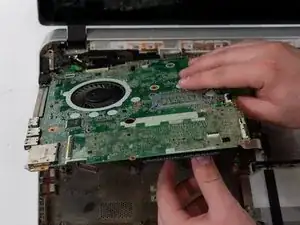Осторожно приподнимите материнскую плату вверх, в сторону экрана. Снимите оставшийся кабель дисплея.
