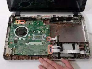 Убедитесь, что отсоединены три ленточных кабеля, соединяющие клавиатуру, тачпад и кнопку питания с материнской платой.
