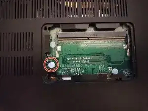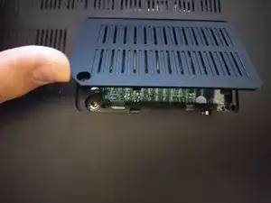 Чтобы собрать устройство, нажмите крышку слота для оперативной памяти обратно на отверстие, сначала вставив её верхней частью, а затем нажав вниз, чтобы она встала на уровень с остальным шасси. Затем прикрутите её единственным монтажным винтом.