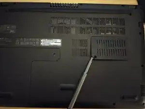 Открутите единственный винт с панели доступа к оперативной памяти, как показано, используя отвертку PH1 (или аналогичную). Затем подденьте панель снизу.