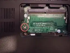 Найдите переключатель вторжения шасси, находящийся в нижнем левом углу открытой части платы. Вам может понадобиться положить немногоBlu-Tack или очень тонкой ленты сверху, чтобы помочь с нажатиям на него. К счастью, эта часть платы не будет слишком нагреваться, так что не имеет значения, что вы положите туда, чтобы нажать на переключатель в крышке слота для оперативной памяти.