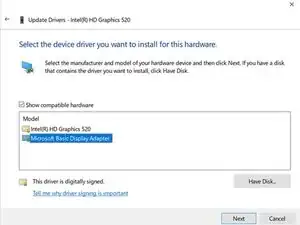 Названия пунктов в этом списке могут отличаться для вашего компьютера. Если у вас есть пункт под названием "Microsoft Basic Display Adapter", выберите его и нажмите Дальше. Если его нет в списке, выберите тот, у которого самая старая дата в названии.