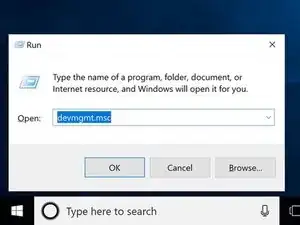 В окне выполнить введите "devmgmt.msc" и нажмите кнопку OK.