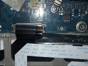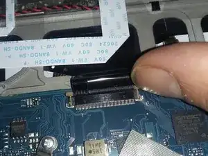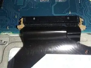 Обратите внимание на разъем клавиатуры на картинке, фиксированный пластиковыми защелками. Осторожно расщелкните защелки с обеих сторон и извлеките ленту из разъема.