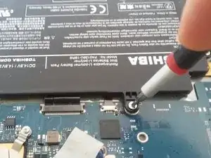 Отключите батарею с многоцветными проводами и с помощью отвертки открутите 4 винта, которые ее фиксируют. Удалите батарею.