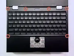 Удалите следующие винты, крепящие рамку клавиатуры к основному корпусу:
