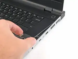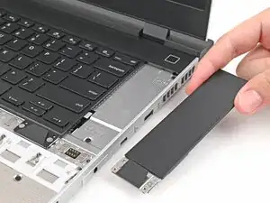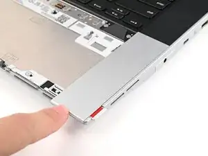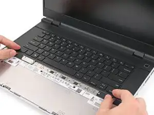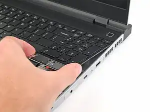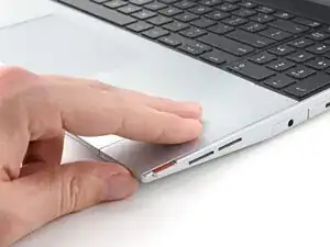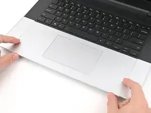 Используя пальцы, сдвиньте распорку тачпада в направлении нижнего края ноутбука и отщёлкните её.