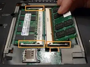 Снимите обнаруженные модули оперативной памяти, отводя защёлки наружу (в сторону от краёв модулей).