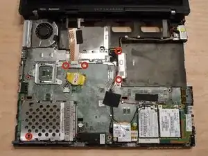Открутите пять серебристых винтов Phillips #1 длиной 3 мм, крепящих материнскую плату.