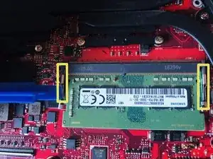 Нажмите на фиксаторы по обе стороны модуля оперативной памяти, отведите их в стороны — это освободит модуль, и он отскочит под углом ~45°. Теперь можно аккуратно вынуть модуль.