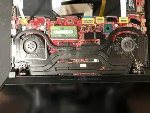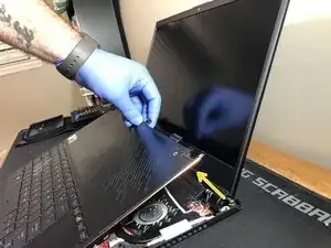 Когда крышка ослабнет, аккуратно отключите 2 кабеля, отмеченные желтым, которые подключают её к материнской плате.