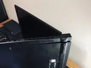 Затем откройте ноутбук примерно на 45 градусов и положите его на бок, как показано. В таком положении можно снять пылезащитную крышку, слегка покачивая её.