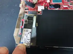 Далее отогните ленту, закрывающую SSD, и снимите винт, фиксирующий SSD.