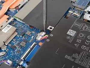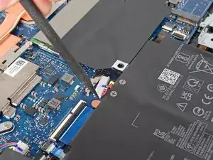 Используйте конец лопатки, чтобы выдвинуть боковые фиксаторы разъёма батареи из его гнезда.