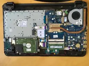 С ноутбуком, перевернутым вверх дном на столе, задняя пластина снимется, оставив все PCB и динамики подключенными к задней части клавиатуры/тачпада.