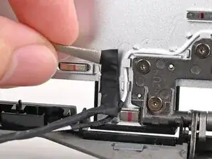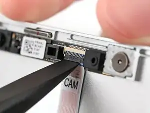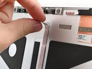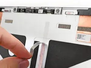 Аккуратно отклейте плоскую часть кабеля веб-камеры от фиксирующего основания в верхней части верхней крышки.