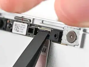 Вставьте плоский конец отвёртки Framework под кабель веб-камеры вблизи разъёма ZIF и поверните, чтобы выдвинуть разъём из гнезда.