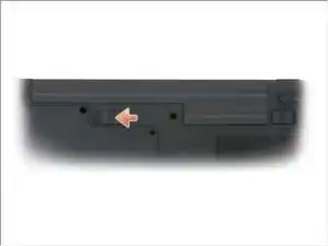 Чтобы разблокировать батарею, переверните ноутбук так, чтобы его нижняя часть была обращена вверх. Затем разблокируйте левый зажим, сдвинув его влево.