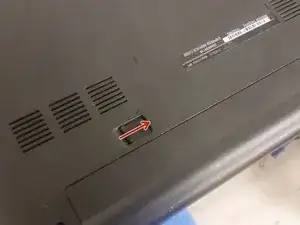 Переверните ноутбук. Стороной батареи к себе, сдвиньте замок вправо.