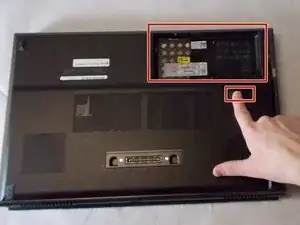 Сдвиньте защелку для разблокировки аккумулятора перед его удалением. Чтобы снять крышку корпуса, необходимо открутить винт с крестообразной головкой с обоих концов ноутбука в отсеке аккумулятора, прежде чем поднимать ее с стороны винтового отверстия.