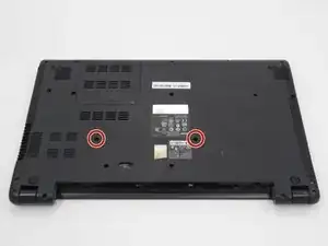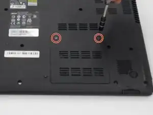 Отверните два винта Phillips №00 длиной 7 мм на нижней панели ноутбука.