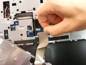 Отсоедините клавиатуру, потянув за синюю ленту на жгуте проводов.