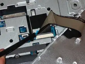 Используйте лопатку, чтобы отогнуть белую защелку вверх от жгута проводов, расположенного в левом верхнем углу тачпада.