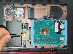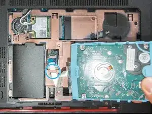 С помощью пластикового инструмента подденьте жёсткий диск и вытащите его из отсека. Держа диск в руке, освободите кабель из удерживающего отверстия в корпусе и отложите диск в сторону.