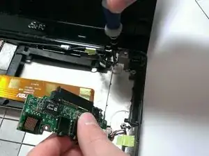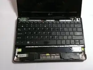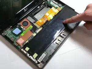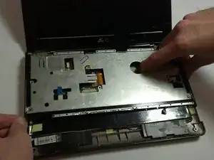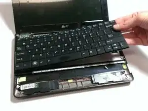 Клавиатура: Поднимите боковую часть клавиатуры осторожно и отключите прикреплённую ленточную шлейф, расположенную под клавиатурой.