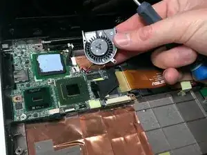 Используйте плоскую отвёртку, чтобы аккуратно приподнять медный радиатор, и снимите его пальцами с ноутбука.