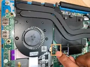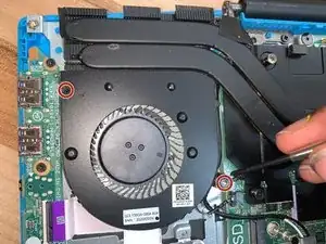 Найдите левый вентилятор и открутите оба винта крестовой отверткой #1.