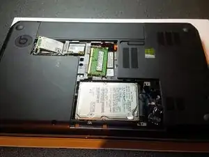 после снятия аккумулятора и крышек вы увидите жёсткий диск, модуль Wi‑Fi m‑SATA и оперативную память. Также вы увидите батарейку BIOS (рядом с жёстким диском).