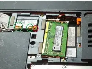снимите две антенны (белую и чёрную) и открутите винт модуля m‑SATA. Модуль приподнимется к вам после отвинчивания. Антенны находятся в зелёном круге, а винт — в красном круге.