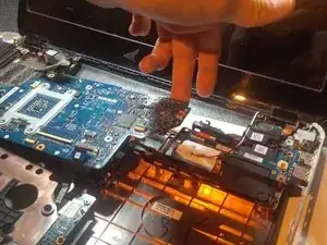 снимите разъём экрана. будьте очень очень осторожны.. потяните чёрную защёлку (в лаймовом квадрате) на себя.