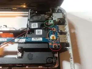 теперь снимем модуль USB. Открутите винт в красном круге, отсоедините аудиокабель в оранжевом круге и открутите винт в зелёном круге. Это винт металлической пластины разъёма питания DC.