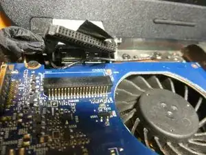 Отключите кабель дисплея на левой стороне. Сначала частично оторвите ленту, затем с помощью отвертки помогите отсоединить кабель. По бокам есть маленькие защёлки для помощи.