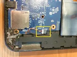 На верхней части ноутбука, вблизи верхнего правого угла, поднимите чёрную часть и отсоедините кабель USB-порта. Затем отсоедините кабель питания, вытянув его.