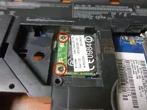 Переверните ноутбук и открутите беспроводную карту. Она выскочит, как и планки оперативной памяти. Сдвиньте её и отложите в сторону.