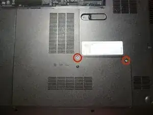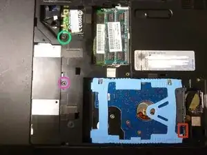 На нижней панели ноутбука снимите этот винт, затем поднимите левую сторону SATA-узла прямо вверх, чтобы отсоединить его от платы. Уберите и отложите в сторону.